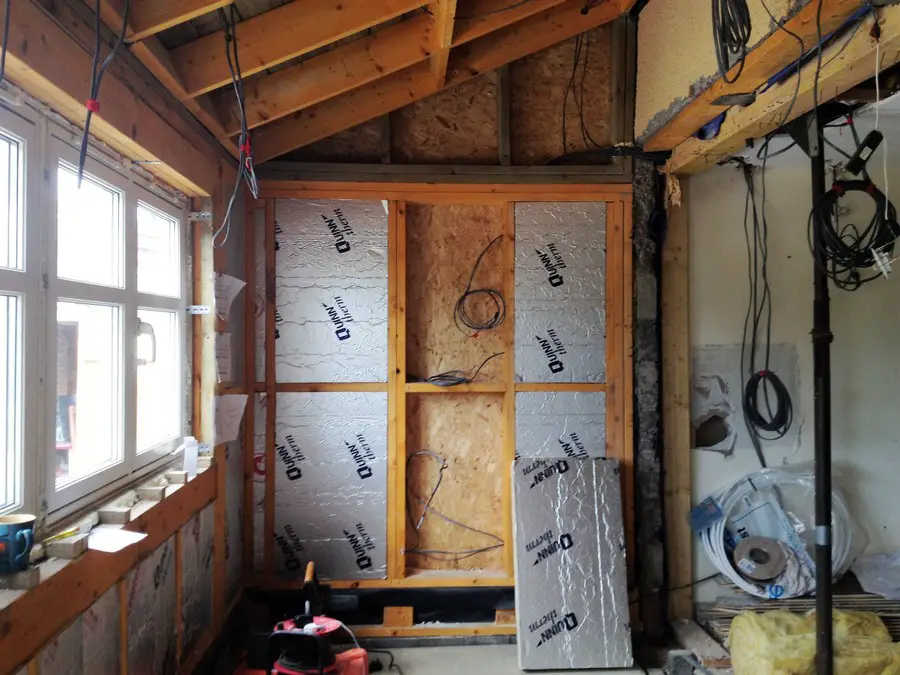 The timber kit construction has started with the walls almost completed, clad in weather-proof paper: